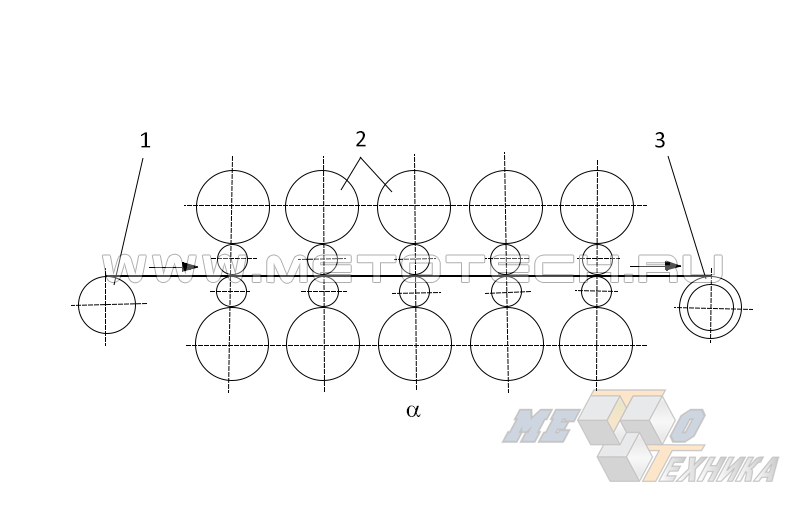 Рисунок 3. Схема стана холодной прокатки: 1-разматывающее устройство; 2-рабочие валки; 3-наматывающий барабан с тянущим усилием.